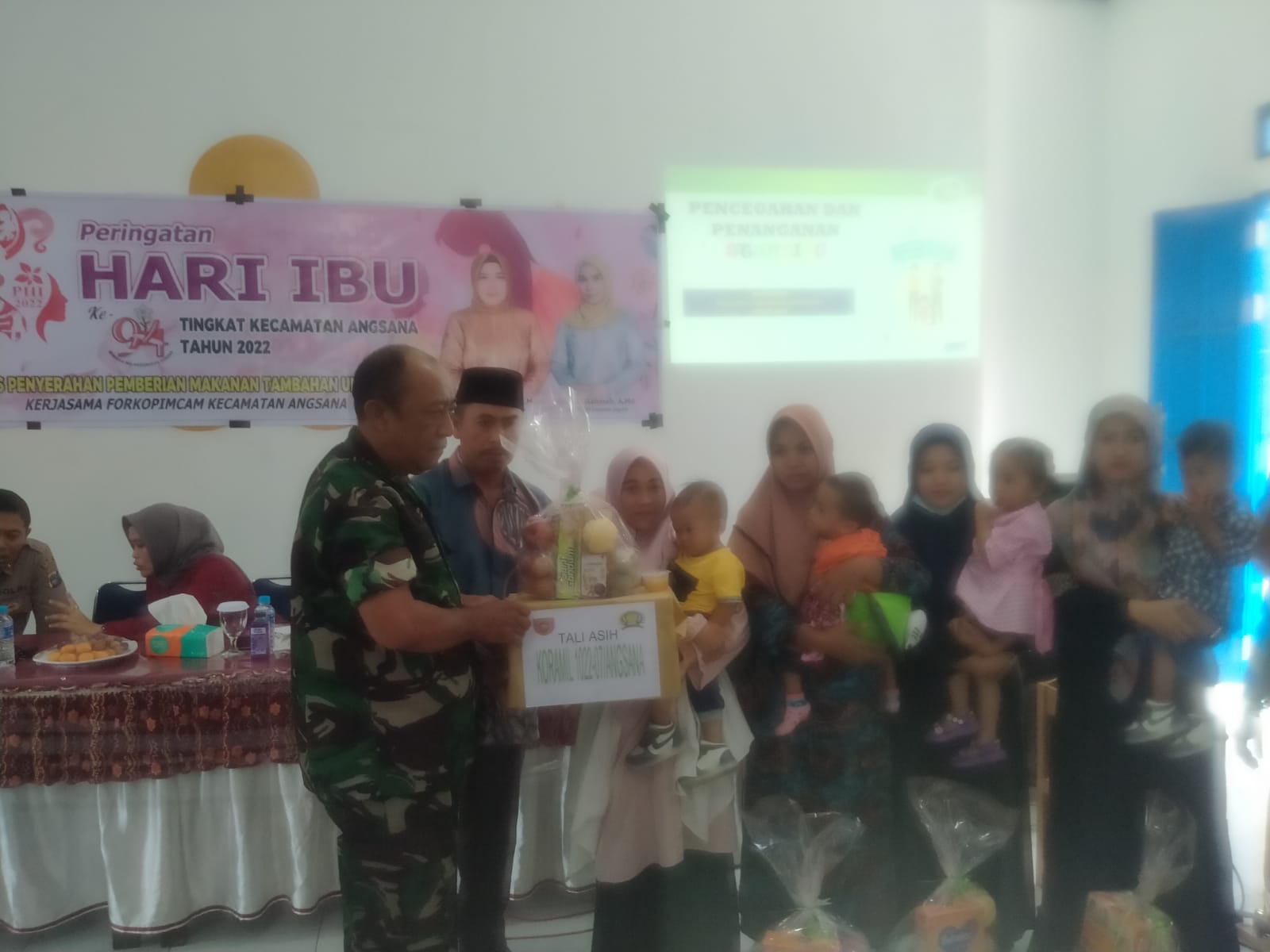 NARASINUSANTARA.COM, BATULICIN – Dalam rangka Peringatan Hari Ibu (PHI) Tahun 2022 Kecamatan Angsana, diwarnai dengan penyerahan tali asih (Sembako) dan makanan tambahan kepada puluhan anak balita oleh Danramil 1022-07/Angsana, Kapten Inf Aries. P.H, di Balai Ekonomi Kreatif Kecamatan Angsana (Kec. Angsana), Selasa (27/12/2022).