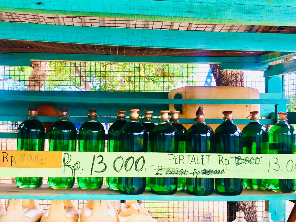 “Kalau saya beli sendiri Pertalite ke Pom/SPBU disana, kena ‘cas’, saya beli misal 60 liter dengan harga Rp. 600.000 jadi Rp.615.000, sedangkan beli di pelangsir BBM untuk di muat di botol per liternya ada kurang pasnya, hasilnya coba liat di toko lain dengan harga jual Rp12.000 per liter/botol terlihat isinya tidak penuh hingga ke garis tutup botol, karena pas dituangkan ke botol jualan ternyata kurang, misal harusnya dapat 15 botol jadi 14 botol saja,” bebernya.
