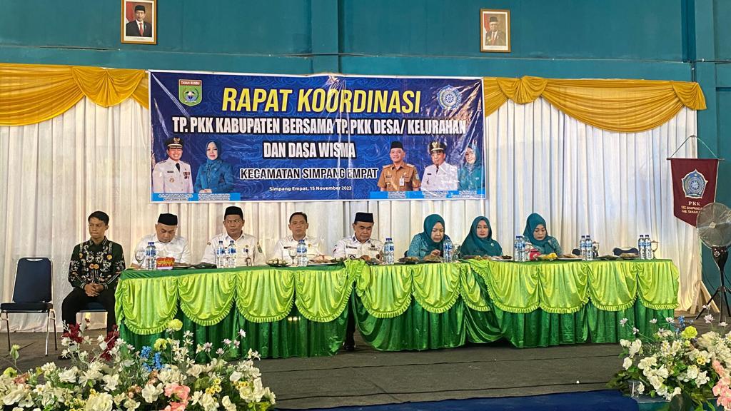 Rakoor ini juga dihadiri oleh Ketua TP PKK Kabupaten, Hj Wahyu Windarti Zairullah, sebagai narasumber utama, Kepala Dinas PMD Samsir, serta diikuti oleh Ketua TP PKK Kecamatan Simpang Empat dan 300 peserta dari TP PKK Desa dan Dasa Wisma.