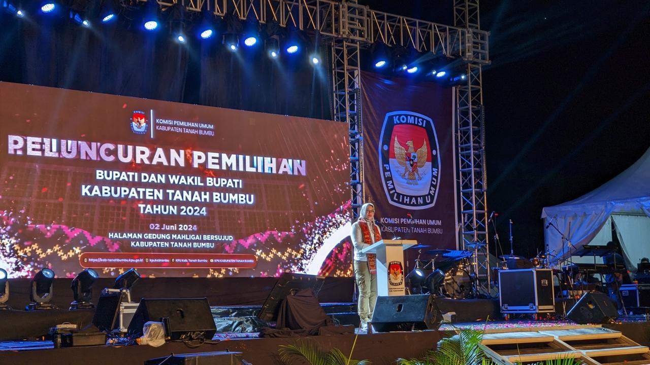 NARASINUSANTARA.COM, TANAH BUMBU – Ketua KPU Kalsel, Dr. Andi Tenri Sompa pada saat menghadiri acara, Peluncuran Pemilihan Bupati dan Wakil Bupati Kabupaten Tanah Bumbu Tahun 2024, bertempat di Halaman Gedung Mahligai Kapet, Minggu (02/06/2024) Malam.
