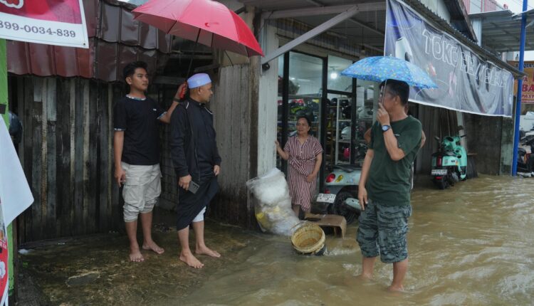 Mengenakan baju gamis hitam, Wabup menyempatkan diri bertemu langsung dengan warga, termasuk pemilik toko yang tempat usahanya terdampak genangan air.