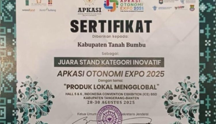 NARASINUSANTARA.COM, TANAH BUMBU – Kabupaten Tanah Bumbu menerima penghargaan Stand Kategori Inovatif pada gelaran Apkasi Otonomi Expo (AOE) 2025, 28-30 Agustus 2025 di Indonesia Convention Exhibition (ICE) BSD, Tangerang.