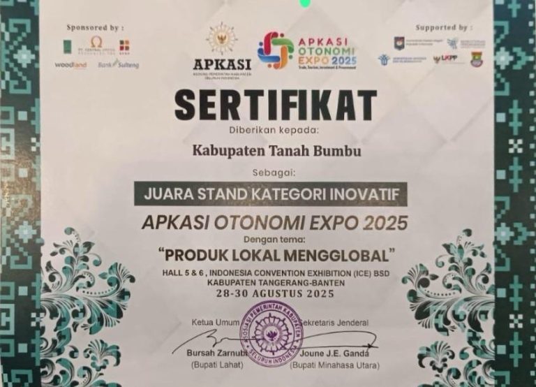 NARASINUSANTARA.COM, TANAH BUMBU – Kabupaten Tanah Bumbu menerima penghargaan Stand Kategori Inovatif pada gelaran Apkasi Otonomi Expo (AOE) 2025, 28-30 Agustus 2025 di Indonesia Convention Exhibition (ICE) BSD, Tangerang.